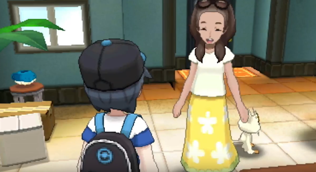 Ainda em casa, vemos a mãe do nosso personagem (que é estranhamente semelhante à Shauna) e um Meowth doméstico (aparentemente pequeno mas é de salientar que as proporções de humanos e Pokémon mudaram em relação à tridimensionalidade de XY e ORAS).