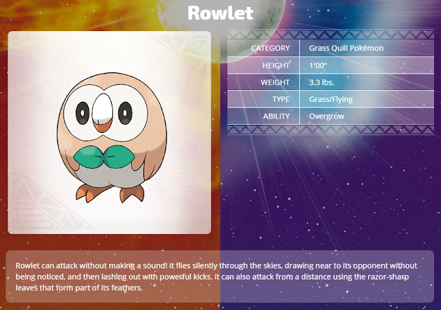 A primeira opção de escolha é, seguindo a tradição, o inicial de Erva, representado pelo altamente adaptável Pokémon Grass Quill, Rowlet. Este Pokémon consegue voar silenciosamente pelos céus, aproximando-se do seu adversário sem ser detetado. Pode atacar os seus adversários utilizando pontapés poderosos e ainda atacar à distância com folhas extremamente afiadas, integradas nas suas penas. O Rowlet observa o ambiente que o rodeia, rodando o seu pescoço quase 180 graus, de frente para trás, para poder ver o que se encontra mesmo atrás de si. Nas batalhas, o Rowlet roda a cabeça para olhar para o seu Treinador enquanto aguarda instruções.