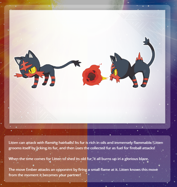 Fogo é representado pelo calmo Pokémon Fire Cat, Litten e é a segunda escolha para primeiro Pokémon parceiro. O pelo do Litten é rico em óleos e altamente inflamável. Penteia-se constantemente, lambendo o seu próprio pelo que utiliza para fazer bolas. Em seguida, incendeia estas bolas de pelo para lançar ataques com bolas de fogo. Quando Litten muda de pelo, todo o seu pelo antigo arde num fogo glorioso.