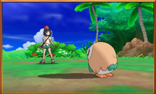 O treinador agora permanece em campo em algumas circunstâncias de batalha e neste caso o Rowlet roda a cabeça para o ouvir melhor, o que é simultâneamente prático e... perturbador.