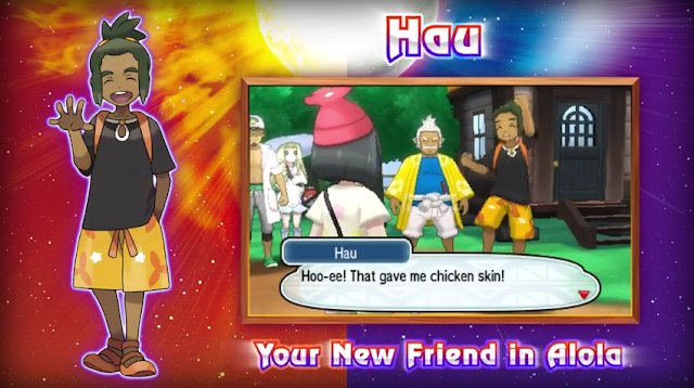 Nada de novo neste campo, Hau já apareceu anteriormente, mais concretamente nos segmentos de trailer dedicados à escolha do Pokémon inicial, pelo que já sabemos de antemão que este vigoroso rapaz - em total contraponto a Lillie em vários aspectos - será um dos nossos rivais. Aparenta ser, à semelhança de tantos outros rivais, o típico vizinho que cresceu com o/a protagonista na mesma aldeia e que parte connosco na jornada pela região.