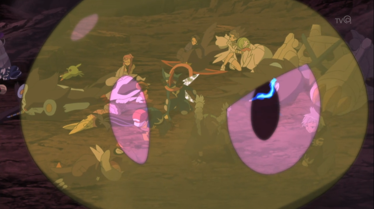 Ash e Alain tentam desesperadamente chegar ao centro do megalito onde está o Chespin de Manon. Todos os treinadores presentes tentam abrir-lhes caminho, pois se retirarem a fonte de energia em teoria o megalito pára.