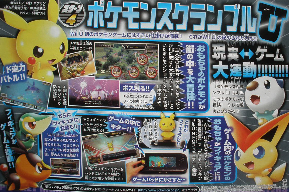 Pokémon Scramble U será lançado no Japão a 24 de Abril de 2013 por 1800 ienes [14,45€]. O jogo terá também uma nova capacidade o Near Field Communication [NFC], o que permite aos jogadores comprar figuras nas lojas dos Pokémon Centers da vida real e eles depois aparecem nos jogos quando os colocam sob a Wii U GamePad. As figuras serão lançadas a 24 de Abril e custarão 200 ienes cada [1,60€]. Pikachu é um de 7 figuras que já foram anunciadas. As figuras podem ser treinadas e os jogadores podem gravar as suas informações de batalha.