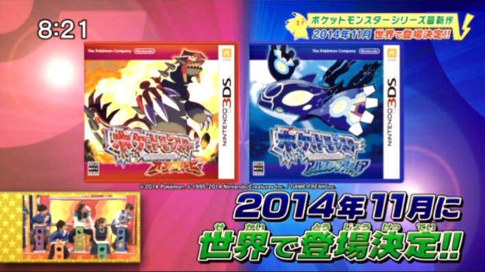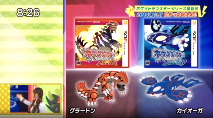 No que diz respeito aos conteúdos inéditos de OmegaRuby e AlphaSapphire, esses ficaram para o final da emissão e, como já referimos, foram muito breves. Fomos presenteados com o que poderá corresponder a parte da sequência de abertura dos remakes, onde as respectivas mascotes de cada versão aparecem em toda a sua glória tridimensional. Groudon surge numa pequena ilha no meio do oceano e Kyogre emerge à superfície do mesmo oceano, uma alusão ao confronto épico entre os dois Pokémon lendários. As sequências, embora integradas no mesmo vídeo, poderão corresponder a uma junção das duas aberturas de cada jogo.