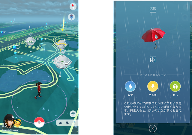 Os padrões climáticos vão causar que diferentes Pokémon apareçam. Por exemplo, Mudkip vai ser mais comum de encontrar quando está a chover. Além disso, os golpes dos Pokémon podem ser afectados pelo clima como nos jogos principais. O clima também pode afectar a quantidade de CP e Stardust recebida normalmente.